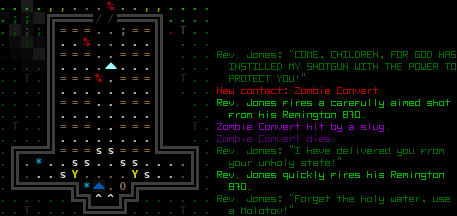 - Melee attacks ('m') are now much more important since you don't start with any guns. Hopefully for your sake you can acquire some real firepower quickly; there are a few fairly good melee weapons to be found, but it's obviously preferable to stay outside melee range of zombies. I've also somewhat lifted the original restriction on melee damage affecting terrain, so with enough strength and/or a good enough weapon you can bash through objects (ex: a sledgehammer should work fairly well on a locked door), useful for quick escapes or gaining access to new areas.