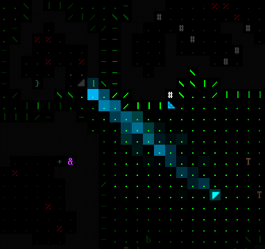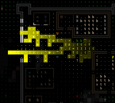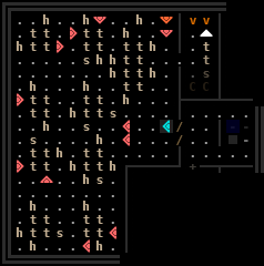 - Most terrain/environment objects can be manipulated ('n')--i.e., almost everything is searchable/usable. (I was going to use the same feature to enable manual talking to NPCs as well, but decided to make conversation automatic on walking up to someone, if they have something to say.)