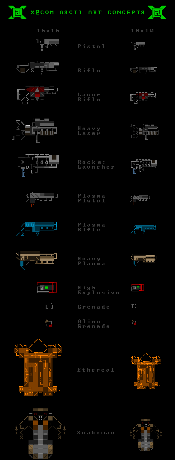 Obviously we want the art to work at any size X@COM can be scaled to, so I drew the above with a 16x16 font, then reloaded them with a smaller font to test their appearance. What do you think? Both look viable to me.