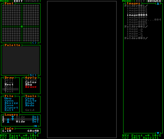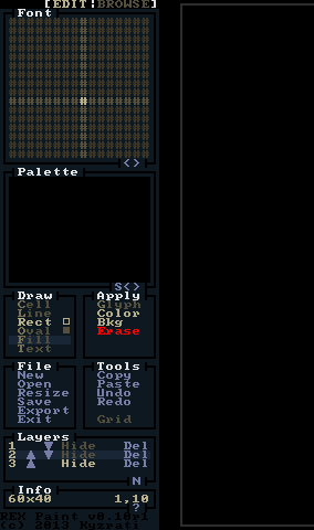 Below are some REXPaint UI mockups, not exactly feature complete (or even correct, since I've changed my mind on a few parts since drawing these up). The second one includes the concept for a browsing mode interface.
