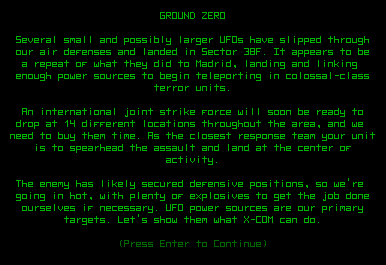 HQ will notify you of the class of UFO at the site (which may be either crash-landed or on the ground carrying out its own mission) and you can opt to press F10 to randomize the mission. As usual, beware facing off against against psionic races since they won't hesitate to mind control your soldiers with perhaps dire consequences for squadmates...