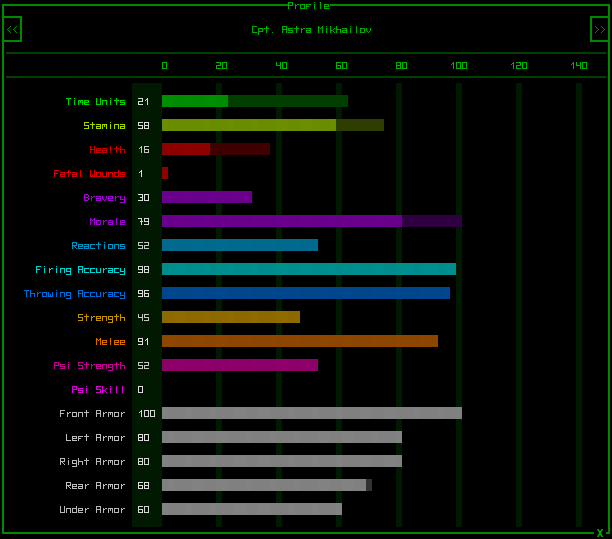 I may at some point add the ability to choose a stat and compare its value across all your squad members, if anyone would find that useful. Also, I'd like to limit the mind probe to sentient units only (which could be easily scripted through the text files using the new object traits system combined with effect conditions), but right now it's like the original X-COM: any target goes. A separate device could be designed for analyzing mechanical targets.