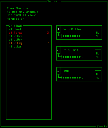 The oh-so-indispensable Medi-Kit is ready to patch up and treat your panicking, bleeding and otherwise not-so-happy-to-be-dying-to-WTF-WAS-THAT soldiers. It'll be much better than what you've had to face so far: Seeing critical wounds as more or less an unavoidable doom counter.