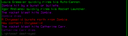 So with another good chunk of the [somewhat boring yet essential] internal stuff behind me, up next are probably special items and Chryssalids/spawning. As with the other mechanics, the latter will be implemented using a pretty dynamic overarching system that will enable creative modding while still being capable of modeling the original X-COM mechanics. Weapon attacks (e.g., Chryssalid bite) will become capable of special effects on the target, one of which will be to cause the target to die and spawn another unit (e.g., zombie) of a specified faction. A greater variety of spawning will also be possible, so instead of just spawning a single unit, you could have the effect be to spawn multiple units nearby (xenojelly/ooze?), or even have a unit that naturally spawns duplicates of itself, or some other specified unit, at certain intervals. Think of all the possibilities! (No, really, think of possibilities you might like to see and tell me about them, so I can make sure they'll be supported.)