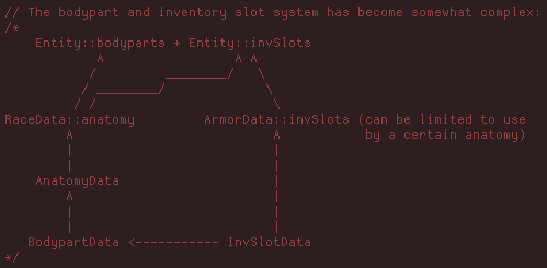 I replaced the inventory system from R5 with a new system that comes with greater versatility at the price of slightly higher complexity. Body parts, rather than inventory slots, are now the fundamental unit for creating an entity (unit). "Body parts" (which each have their own set of properties) can be grouped together to define a certain "anatomy" that applies to one or more races. Body parts and armor each come with their own inventory slots, so combining the two can result in different inventory layouts. Here's a shot of the relationship as commented in the source: